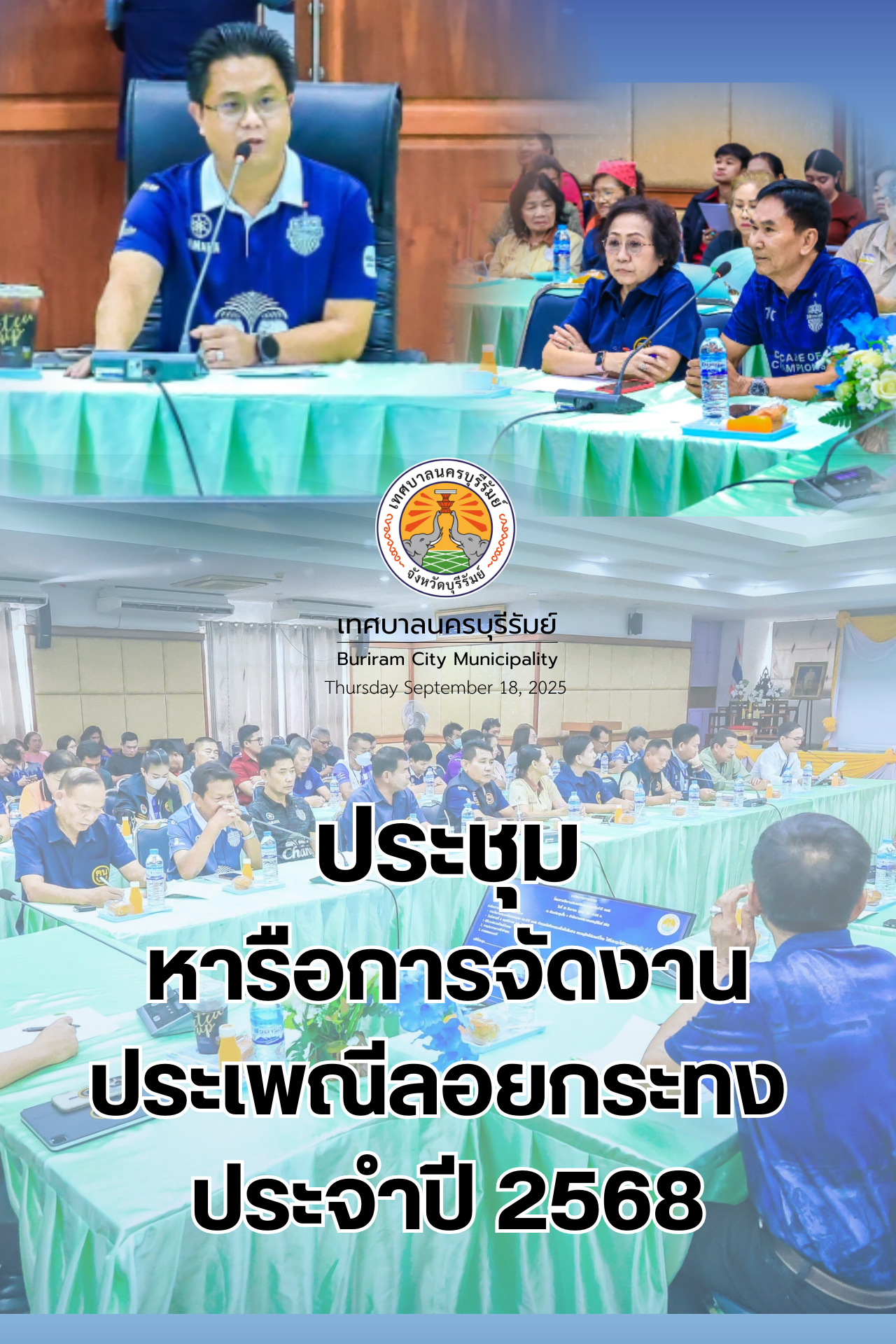 วันที่ 18 กันยายน 2568 นายอนุชิต เหลืองชัยศรี นายกเทศมนตรีนครบุรีรัมย์ เป็นประธานในการประชุมเพื่อปรึกษาหารือการจัดงานประเพณีลอยกระทง ประจำปี 2568 โดยมีคณะผู้บริหาร สมาชิกสภาเทศบาลนครบุรีรัมย์ หัวหน้าส่วนราชการ พนักงานเทศบาล ผู้นำชุมชน รวมถึงผู้ที่มีส่วนเกี่ยวข้อง ร่วมประชุมกันอย่างพร้อมเพรียง ณ ห้องประชุมชั้น 4 เทศบาลนครบุรีรัมย์