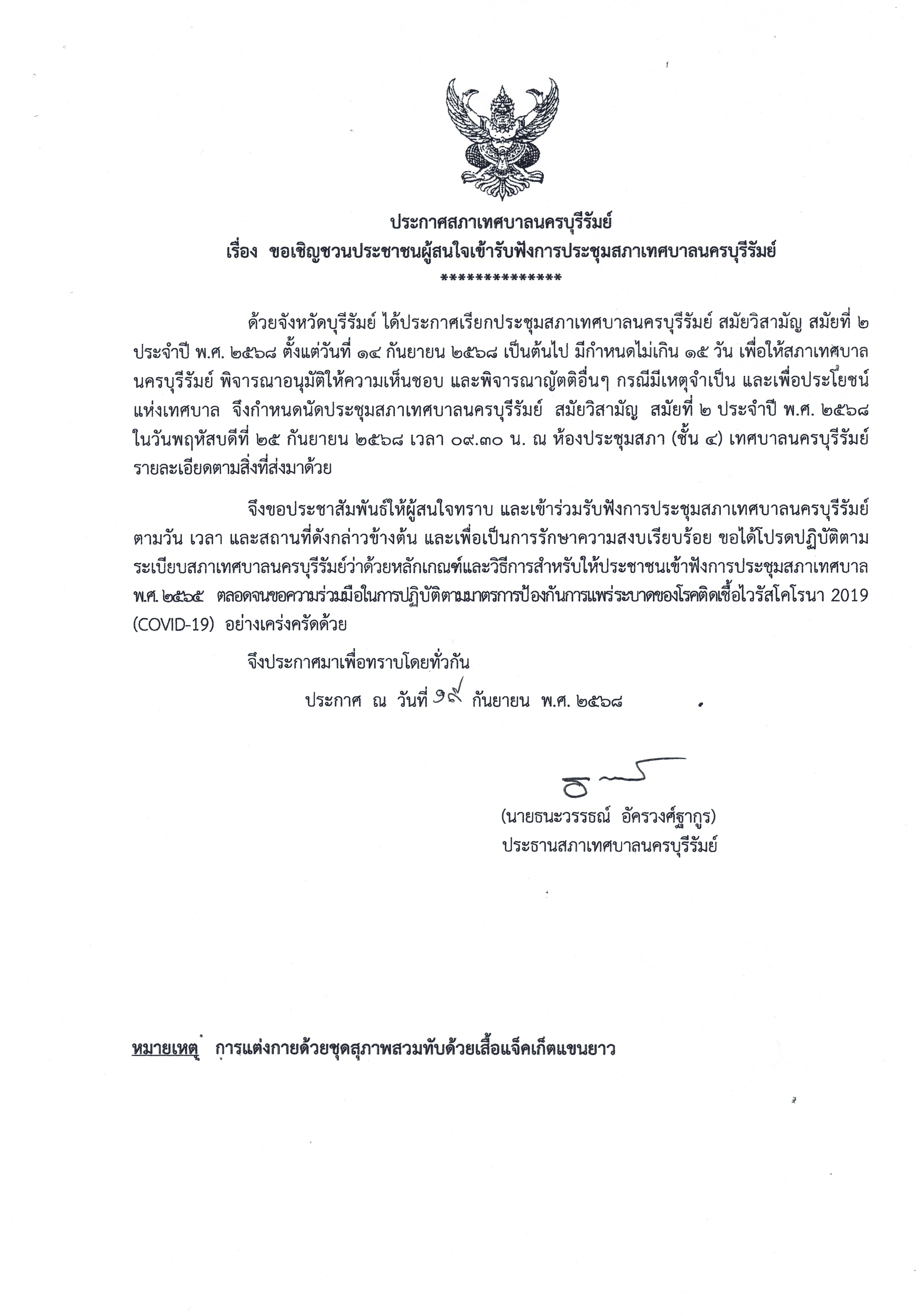ประกาศสภาเทศบาลนครบุรีรัมย์ เรื่อง ขอเชิญชวนประชาชนผู้สนใจเข้ารับฟังการประชุมสภาเทศบาลนครบุรีรัมย์.pdf