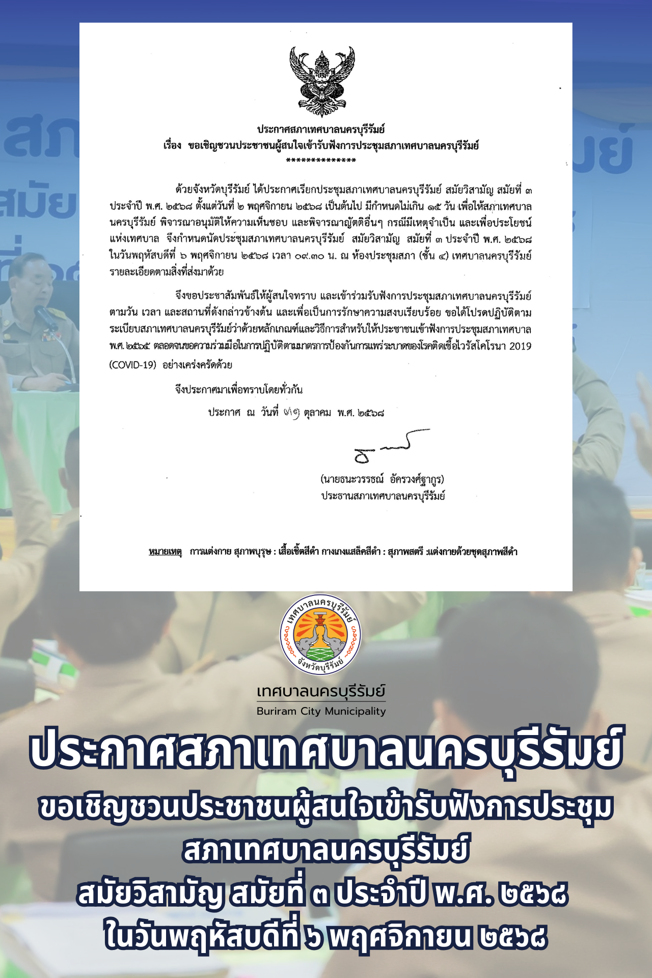 ขอเชิญชวนประชาชนผู้สนใจเข้ารับฟังการประชุมสภาเทศบาลนครบุรีรัมย์ สมัยวิสามัญ สมัยที่ 3 ประจำปี 2568