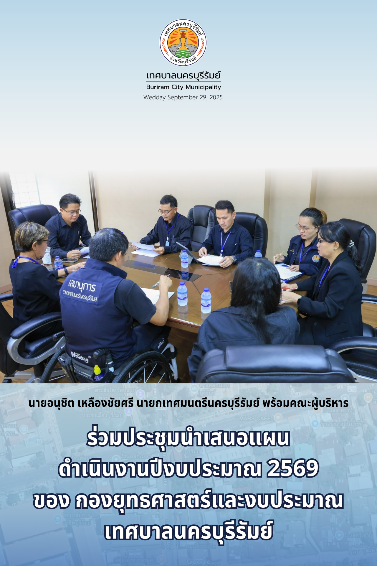 วันที่ 29 ตุลาคม 2568 นายอนุชิต เหลืองชัยศรี นายกเทศมนตรีนครบุรีรัมย์ พร้อมด้วย คณะผู้บริหารเทศบาลนครบุรีรัมย์ กองยุทธศาสตร์และงบประมาณ ร่วมประชุมการนำเสนอแผนดำเนินงานปีงบประมาณ 2569 ณ สำนักงานเทศบาลนครบุรีรัมย์