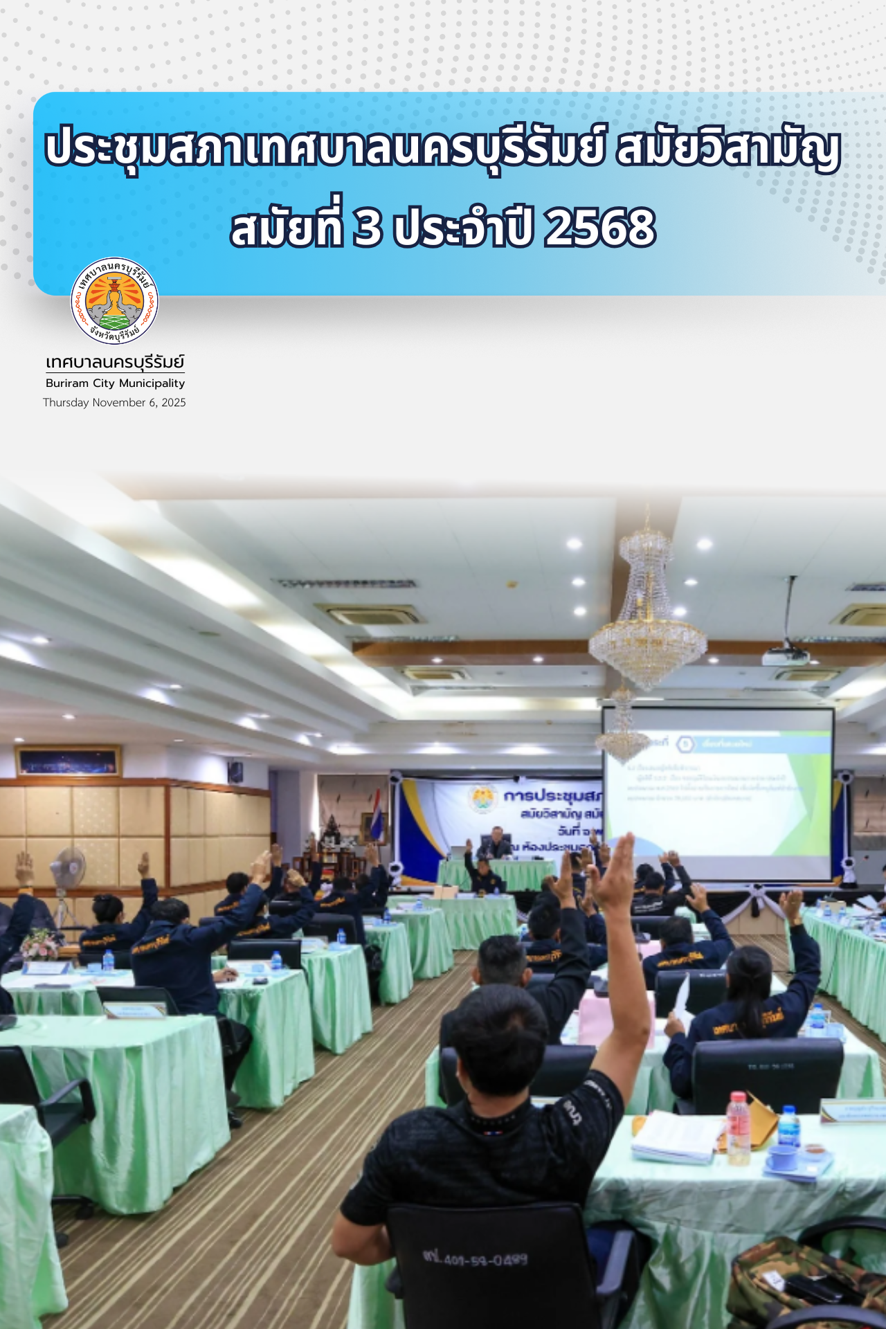 10 พฤศจิกายน 2568 ฮิต: 26 ประชุมสภาเทศบาลนครบุรีรัมย์ สมัยวิสามัญ สมัยที่ 3 ประจำปี 2568 พิมพ์ อ่านเพิ่มเติม...