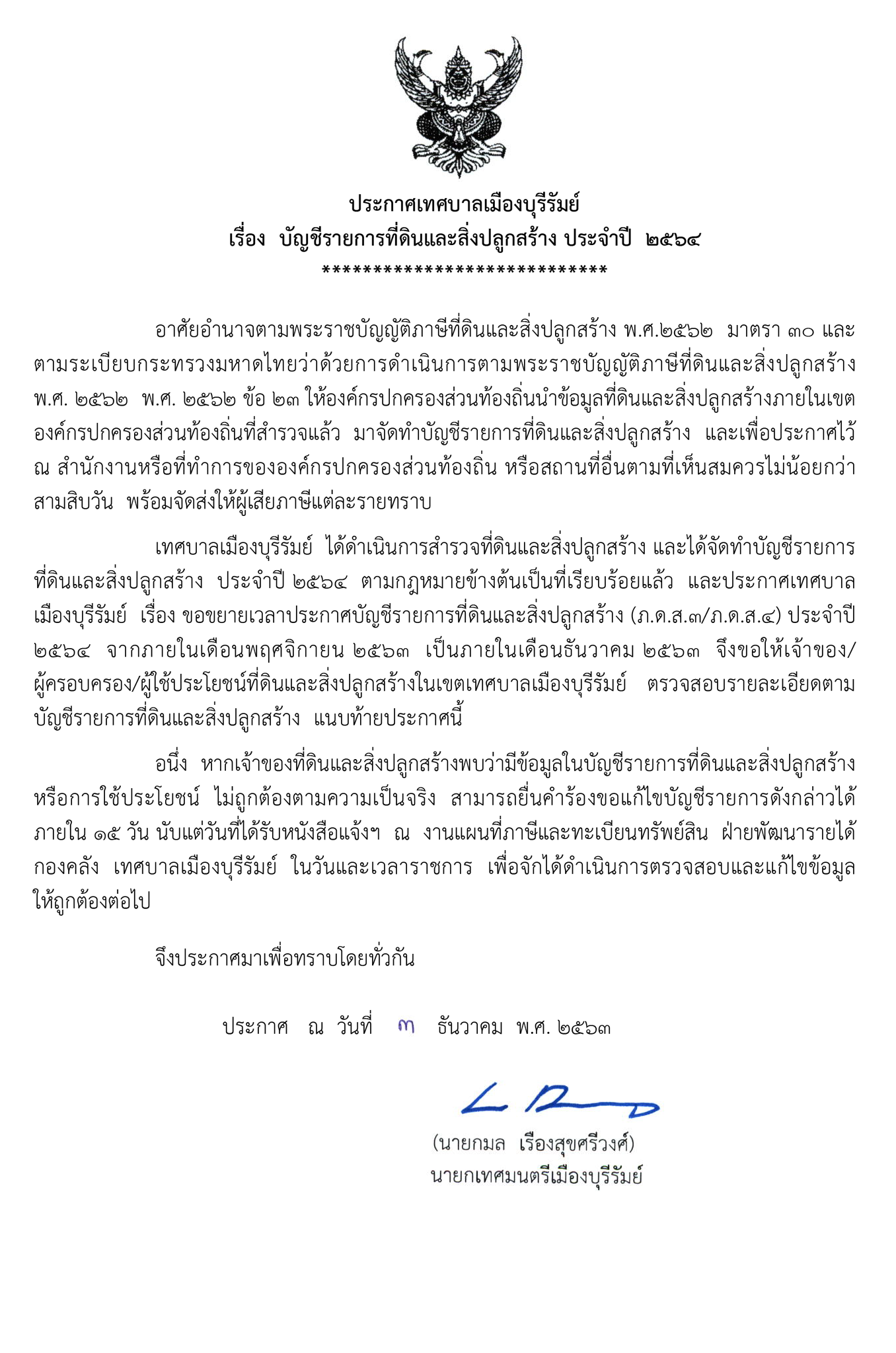 ภาษีที่ดินและสิ่งปลูกสร้าง - ประกาศบัญชีรายการที่ดินและสิ่งปลูกสร้าง บัญชีรายการห้องชุด สำหรับปีภาษี 2564