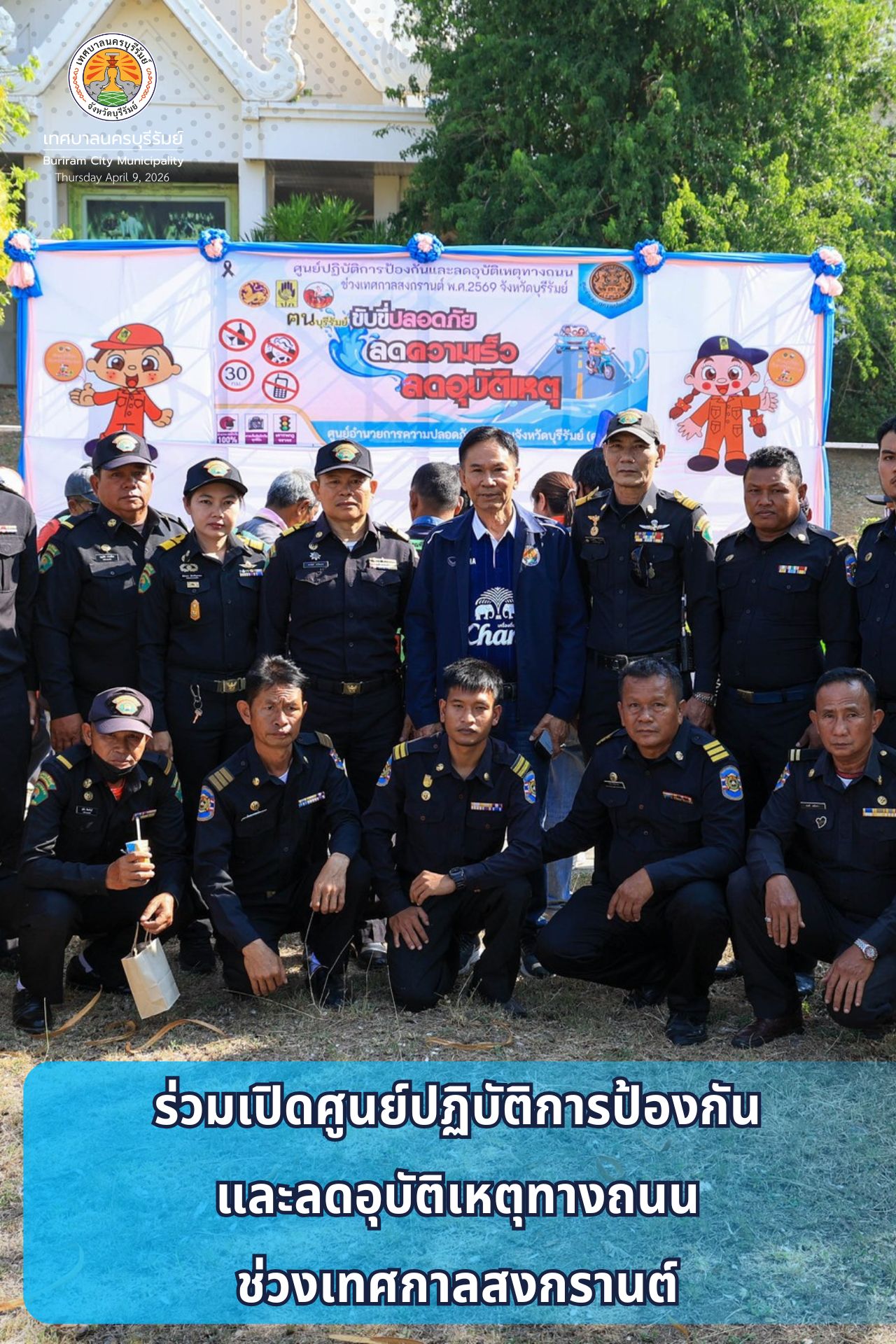 วันที่ 9 เมษายน 2569 นายอนุชิต เหลืองชัยศรี นายกเทศมนตรีนครบุรีรัมย์ มอบหมายให้ นายแพ เดชพร รองนายกเทศมนตรีนครบุรีรัมย์ พร้อมด้วย งานป้องกันและบรรเทาสาธารณภัย งานเทศกิจเทศบาลนครบุรีรัมย์ ร่วมเปิดศูนย์ปฏิบัติการป้องกันและลดอุบัติเหตุทางถนนช่วงเทศกาลสงกรานต์ พ.ศ.2569 จังหวัดบุรีรัมย์ ณ ศาลากลางจังหวัดบุรีรัมย์