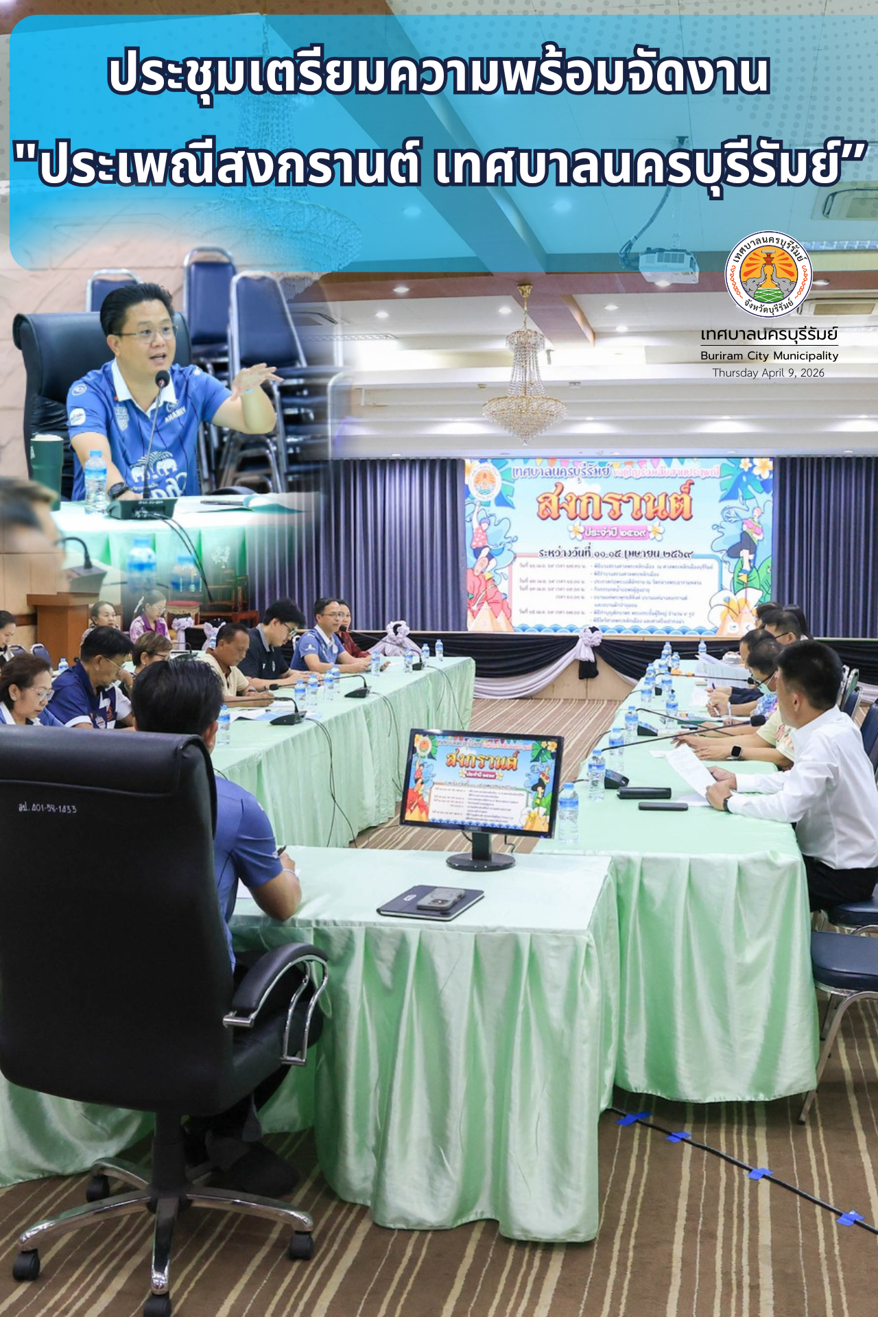 วันที่ 9 เมษายน 2569 ณ ห้องประชุมชั้น 4 เทศบาลนครบุรีรัมย์ นายอนุชิต เหลืองชัยศรี นายกเทศมนตรีนครบุรีรัมย์ เป็นประธานในการประชุมเตรียมความพร้อมจัดงาน "ประเพณีสงกรานต์ เทศบาลนครบุรีรัมย์ ประจำปี 2569" โดยมีคณะผู้บริหาร หัวหน้าส่วนราชการ และพนักงานเจ้าหน้าที่ร่วมประชุมโดยพร้อมเพรียงกัน เพื่อซักซ้อมความเข้าใจและเตรียมต้อนรับพี่น้องประชาชนและนักท่องเที่ยวที่จะมาร่วมสืบสานประเพณีไทย