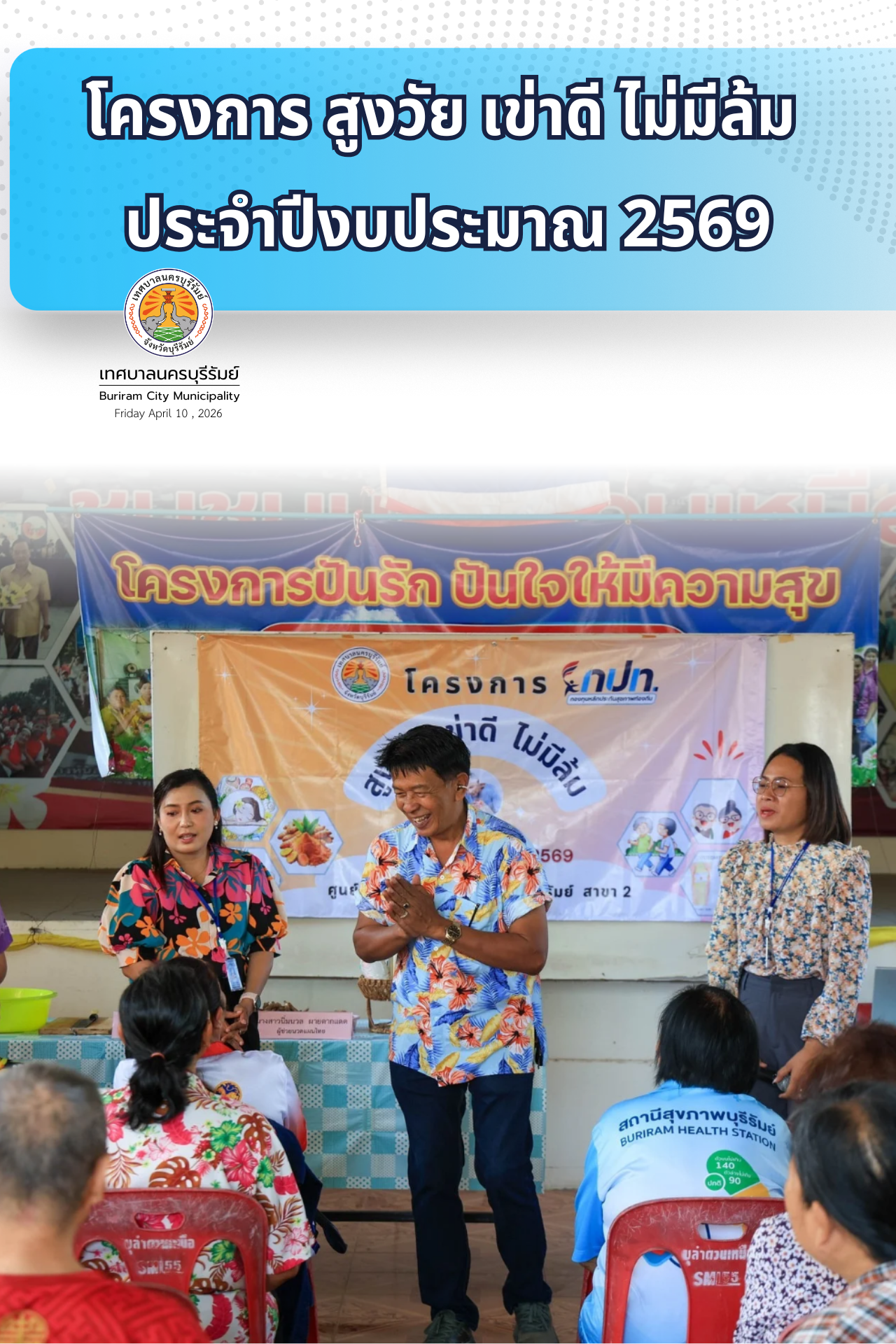 วันที่ 10 เมษายน 2569 นายอนุชิต เหลืองชัยศรี นายกเทศมนตรีนครบุรีรัมย์ ได้มอบหมายให้ นายอำนาจ เพชรเลิศ รองนายกเทศมนตรีนครบุรีรัมย์ ให้เกียรติเป็นประธานเปิดโครงการ สูงวัย เข่าดี ไม่มีล้ม ประจำปีงบประมาณ 2569 พร้อมด้วย หัวหน้าส่วนราชการ พนักงานเจ้าหน้าที่กองสาธารณสุขและสิ่งแวดล้อมเทศบาลนครบุรีรัมย์ และผู้สูงอายุในเขตเทศบาลนครบุรีรัมย์ร่วมโครงการ ณ ศูนย์แพทย์ชุมชนโรงพยาบาลบุรีรัมย์ สาขา 2