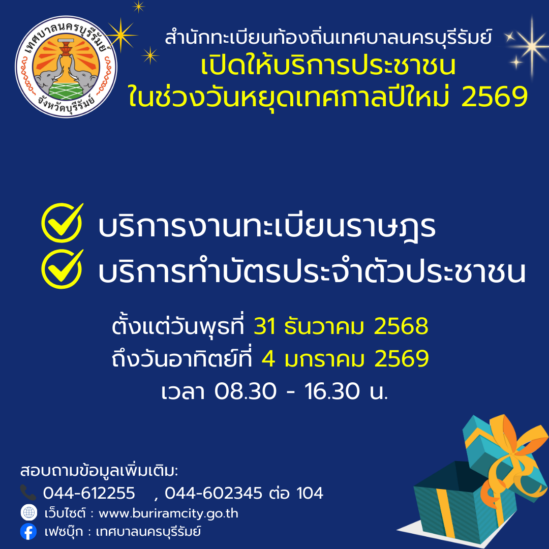 ? ตั้งแต่วันพุธที่ 31 ธันวาคม 2568 ถึงวันอาทิตย์ที่ 4 มกราคม 2569 ⏰ เวลา 08.30 - 16.30 น. ? ณ สำนักทะเบียนท้องถิ่นเทศบาลนครบุรีรัมย์