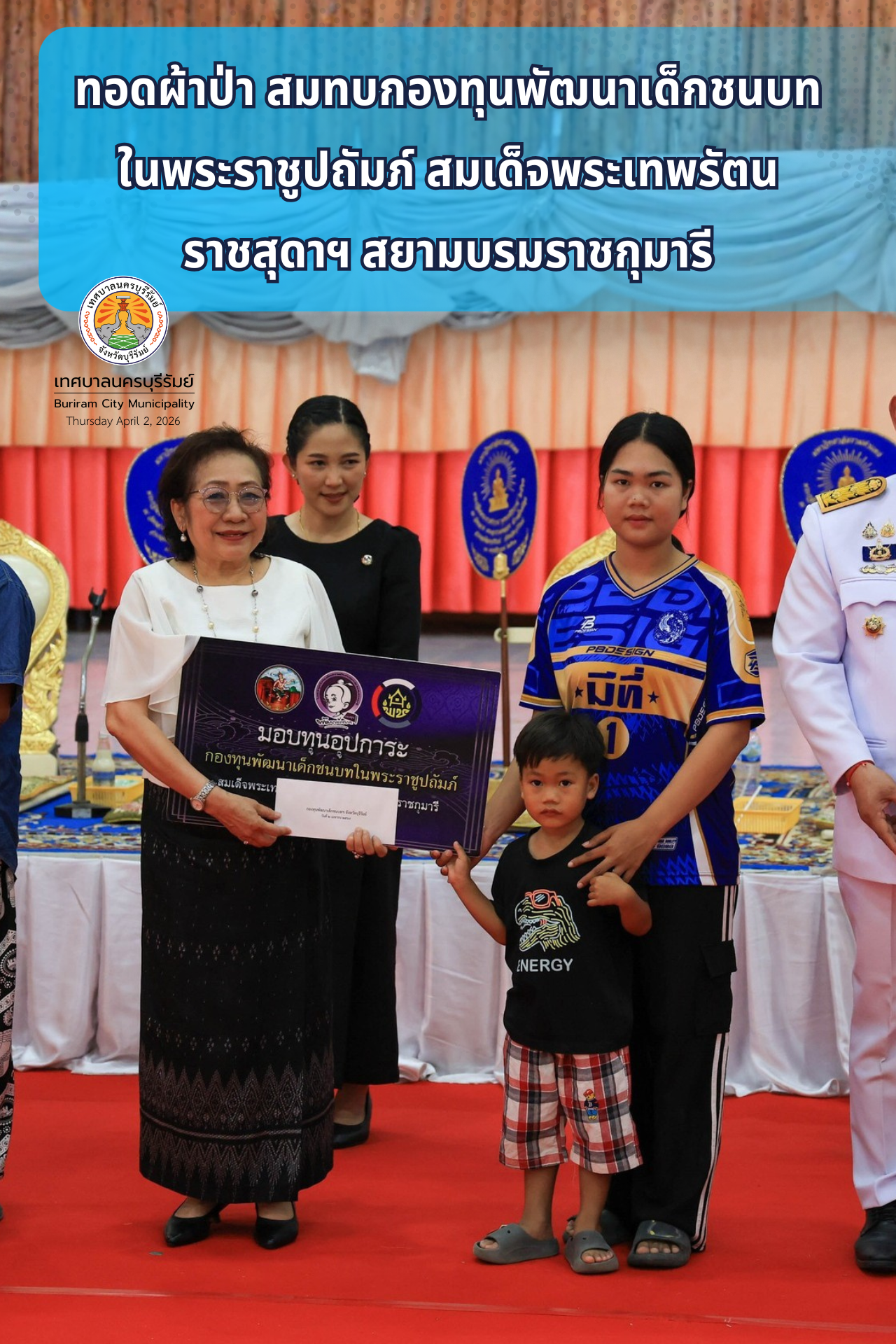วันที่ 2 เมษายน 2569 นายอนุชิต เหลืองชัยศรี นายกเทศมนตรีนครบุรีรัมย์ มอบหมายให้ นางละออ สวัสดิ์พุทรา รองนายกเทศมนตรีนครบุรีรัมย์ ร่วมพิธีทอดผ้าป่า สมทบกองทุนพัฒนาเด็กชนบทในพระราชูปถัมภ์ สมเด็จพระเทพรัตนราชสุดาฯ สยามบรมราชกุมารี โดยมีนายสมบูรณ์ สุธีระกูล รองผู้ว่าราชการจังหวัดบุรีรัมย์ ให้เกียรติเป็นประธานในพิธี ณ วัดกลาง (พระอารามหลวง) อำเภอเมืองบุรีรัมย์ จังหวัดบุรีรัมย์