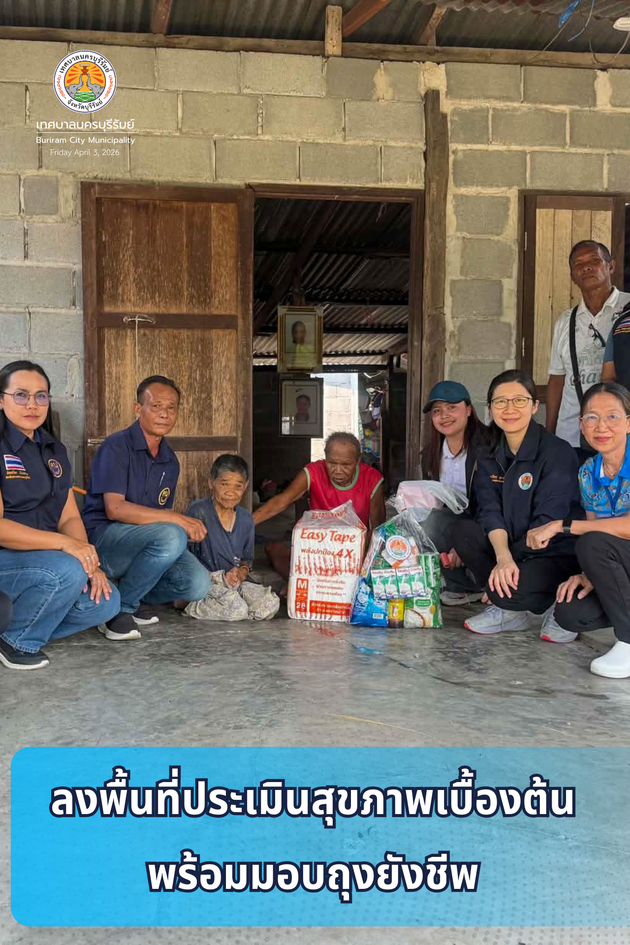 วันที่ 3 เมษายน 2569 นายอนุชิต เหลืองชัยศรี นายกเทศมนตรีนครบุรีรัมย์ มอบหมายให้ นายอุดม ขำชาลี เลขานุการนายกเทศมนตรีนครบุรีรัมย์ พร้อมด้วย สมาชิกสภาเทศบาล นางสาวภรภัทร สงวนสิน ผู้อำนวยการกองสวัสดิการสังคม พนักงานเจ้าหน้าที่กองสวัสดิการสังคมและกองสาธารณสุขและสิ่งแวดล้อมเทศบาลนครบุรีรัมย์ ลงพื้นที่ประเมินสุขภาพเบื้องต้นพร้อมมอบถุงยังชีพให้แก่ นายไหม ลิ้นทอง นางสาวละม่อม ลิ้นทอง ผู้พิการซึ่งประสบปัญหาทางสังคม ณ บ้านศิลาทอง ม.16 ต.เสม็ด