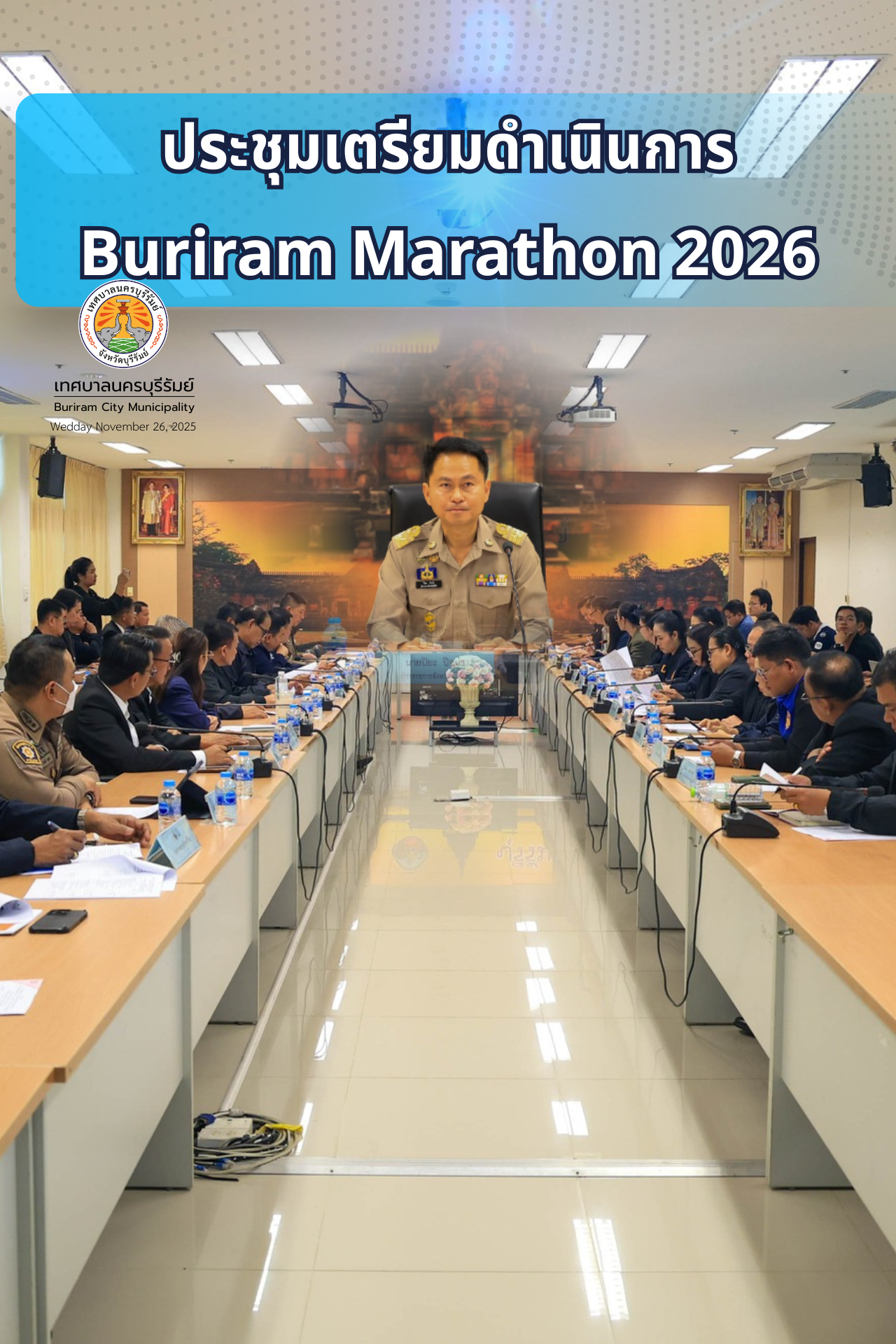 วันที่ 26 พฤศจิกายน 2568 นายอนุชิต เหลืองชัยศรี นายกเทศมนตรีนครบุรีรัมย์ มอบหมาย นายอำนาจ เพชรเลิศ รองนายกเทศมนตรีนครบุรีรัมย์ พร้อมด้วย คณะผู้บริหาร ปลัดเทศบาล หัวหน้าส่วนราชการเเละพนักงานเจ้าหน้าที่เทศบาลนครบุรีรัมย์ ร่วมประชุมเตรียมดำเนินการ Buriram Marathon 2026 ณ ศาลากลางจังหวัดบุรีรัมย์