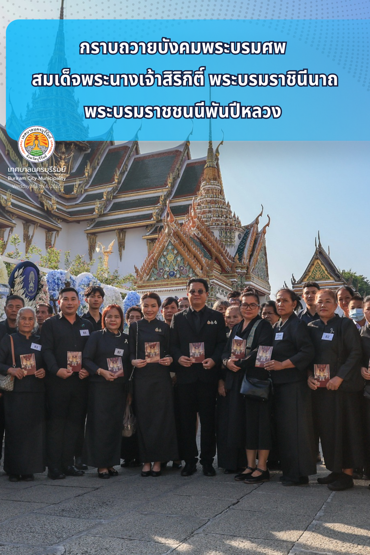 วันที่ 3 มีนาคม 2569 นายอนุชิต เหลืองชัยศรี นายกเทศมนตรีนครบุรีรัมย์ นำคณะผู้บริหาร สมาชิกสภาเทศบาล หัวหน้าส่วนราชการ พนักงานเจ้าหน้าที่ และพี่น้องประชาชนชาวเทศบาลนครบุรีรัมย์ เดินทางเข้ากราบถวายบังคมพระบรมศพ สมเด็จพระนางเจ้าสิริกิติ์ พระบรมราชินีนาถ พระบรมราชชนนีพันปีหลวง ณ พระที่นั่งดุสิตมหาปราสาท ในพระบรมมหาราชวัง
