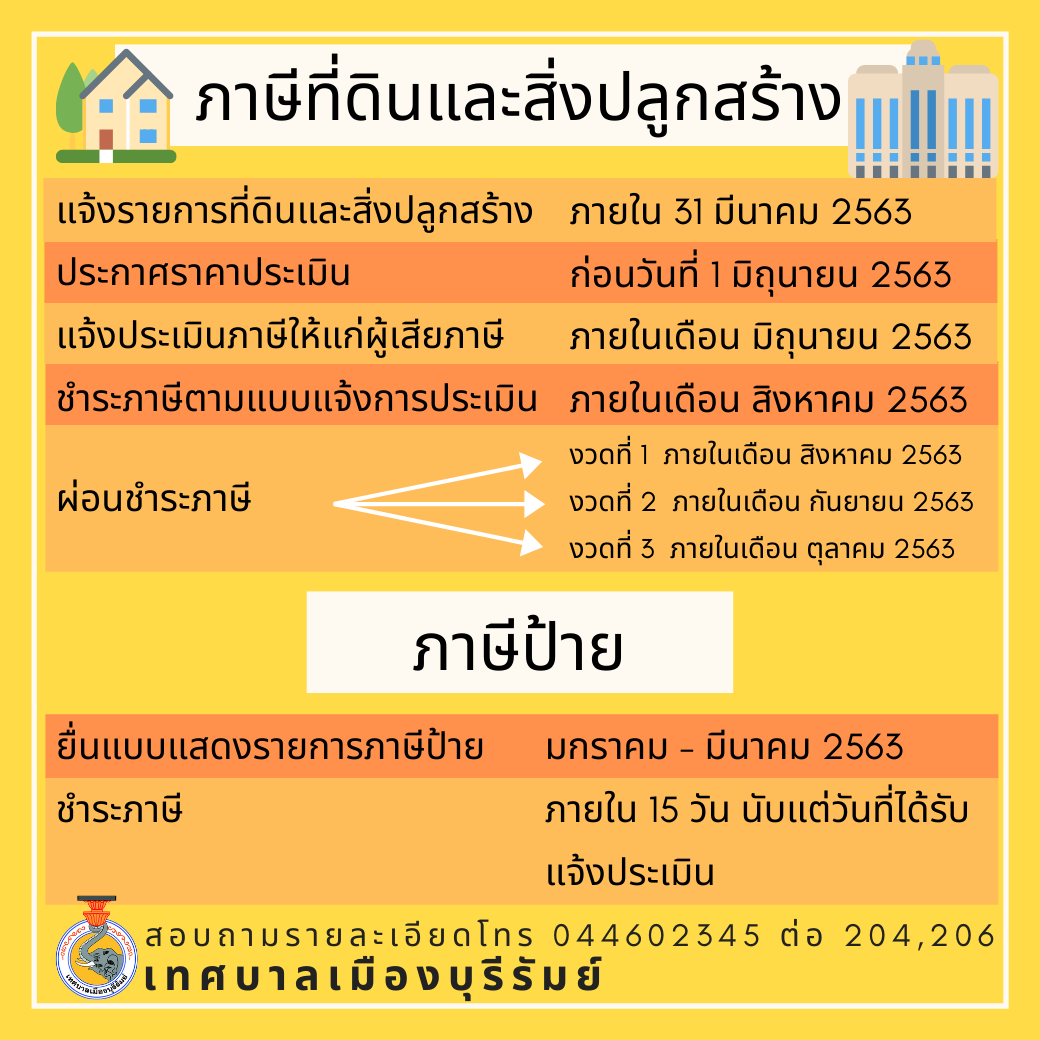 สามารถยื่นแบบและชำระภาษีได้ที่ เทศบาลเมืองบุรีรัมย์ ในวันและเวลาราชการ ตั้งแต่เวลา 08.30-16.30 น. หากมีข้อสงสัยติดต่อสอบถามที่โทรศัพท์ หมายเลข 04460234 ต่อ 204