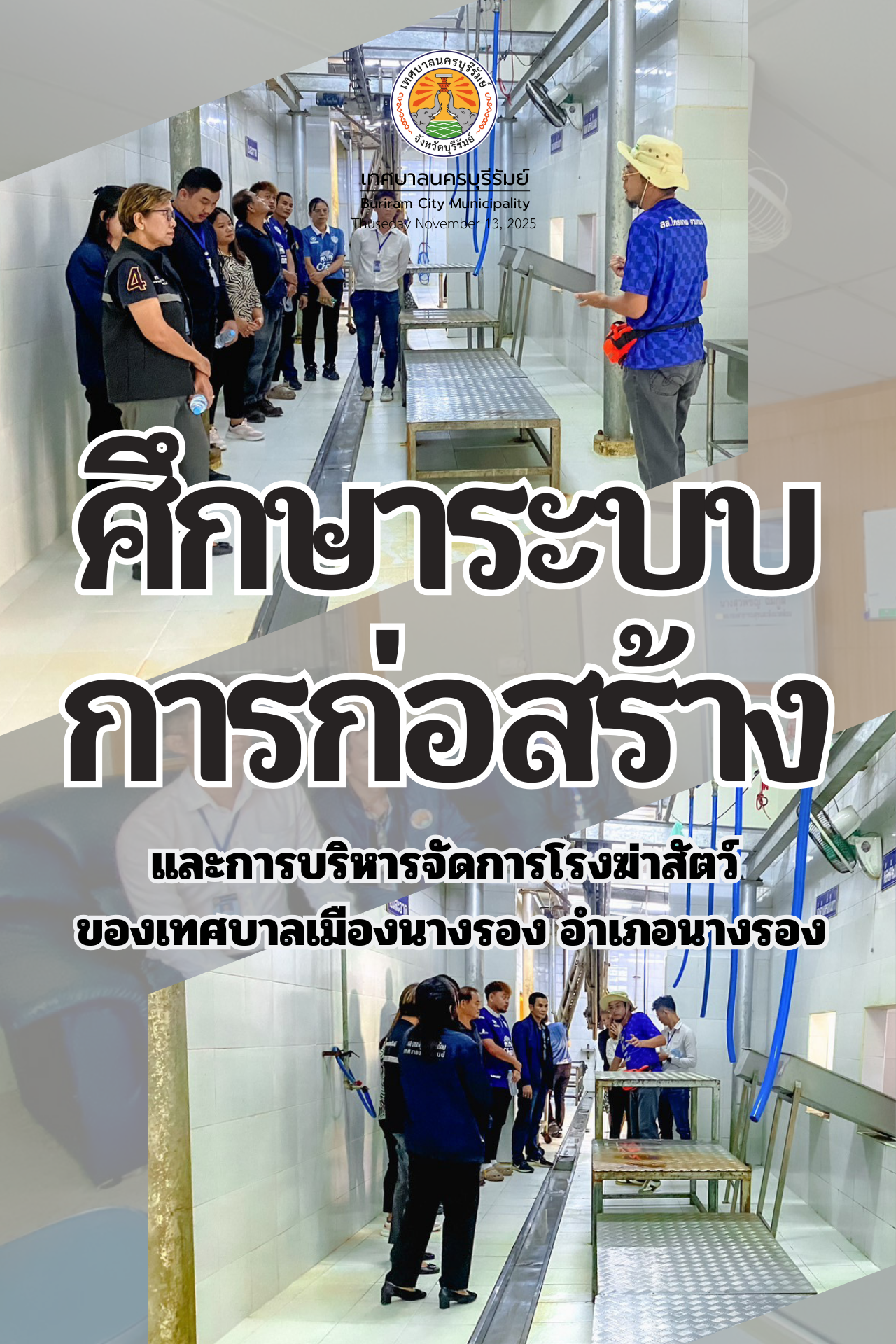 โดยได้มอบหมายให้ นางสิรินันทน์ มณีราชกิจ เลขานุการนายกเทศมนตรีนครบุรีรัมย์ พร้อมด้วย นางสาวนริศรา ดีเกษม ผอ.กองสาธารณสุขและสิ่งแวดล้อม นายสัตว์แพทย์อาวุโส และเจ้าหน้าที่ กองสาธารณสุขและสิ่งแวดล้อม ได้เดินทางไปเพื่อ ศึกษาระบบการก่อสร้างและการบริหารจัดการโรงฆ่าสัตว์ ของเทศบาลเมืองนางรอง อำเภอนางรอง จังหวัดบุรีรัมย์
