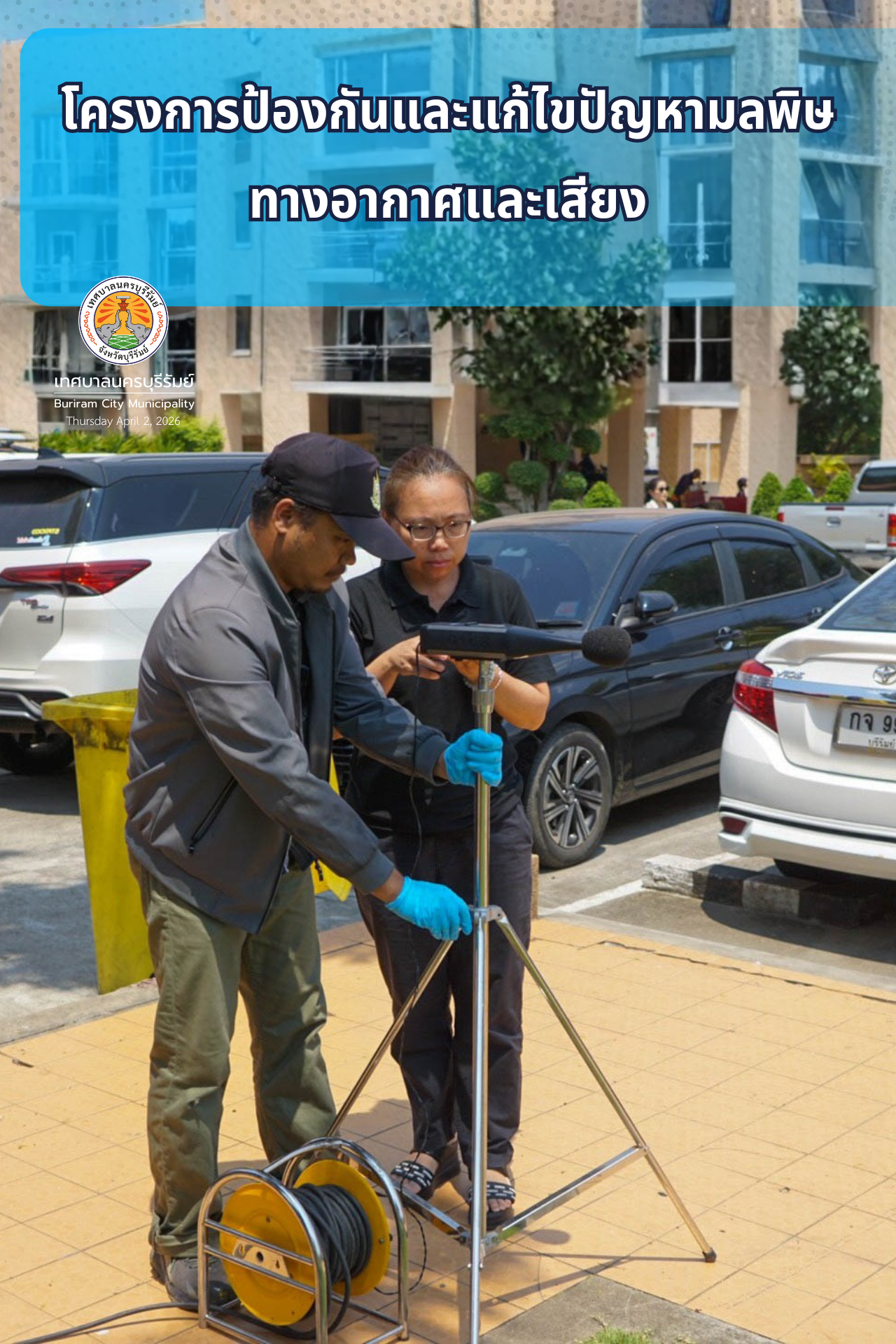 วันที่ 2 เมษายน 256 นายอนุชิต เหลืองชัยศรี นายกเทศมนตรีนครบุรีรัมย์ มอบหมายให้ นางสาวนริศรา ดีเกษม ผอ.กองสาธารณสุขฯ พร้อมด้วย เจ้าหน้าที่ฝ่ายงานสุขาภิบาลอนามัยสิ่งแวดล้อม ลงพื้นที่พร้อมกับเจ้าหน้าที่สำนักงานสิ่งแวดล้อมและควบคุมมลพิษที่ 11 (นครราชสีมา) ตรวจวัดระดับเสียง โดยขอใช้สถานที่ด้านข้างเทศบาลนครบุรีรัมย์ ในการดำเนินโครงการป้องกันและแก้ไขปัญหามลพิษทางอากาศและเสียงโดยกำหนดให้มีการติดตามตรวจสอบคุณภาพอากาศและเสียงในบรรยากาศเฉลี่ย 24 ชั่วโมง ประจำปีงบประมาณ 2569 ณ เทศบาลนครบุรีรัมย์